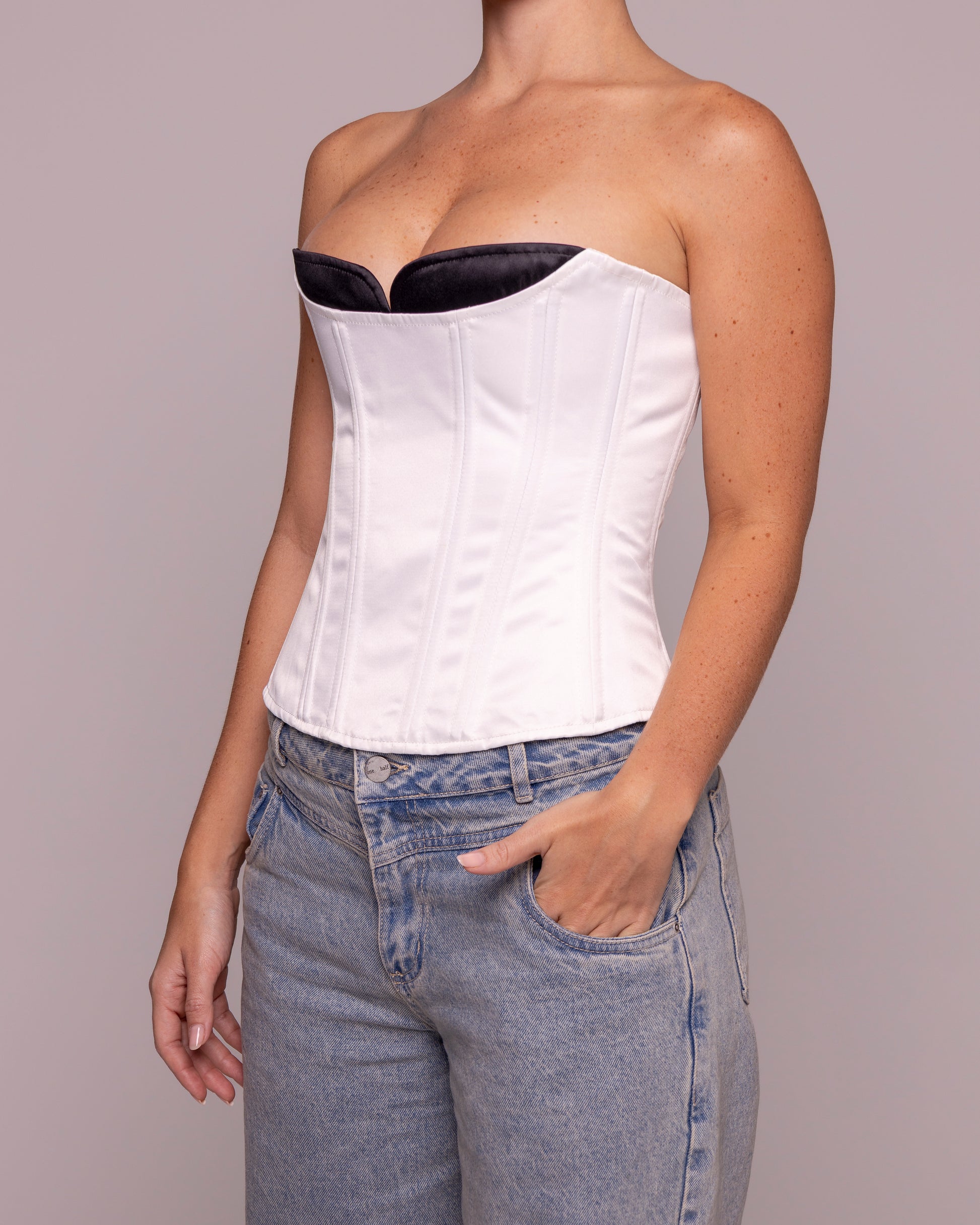 Corset bicolor (blanco y negro) en seda. Con varillas que estilizan tu cintura. Y efecto push up en la parte de los senos.