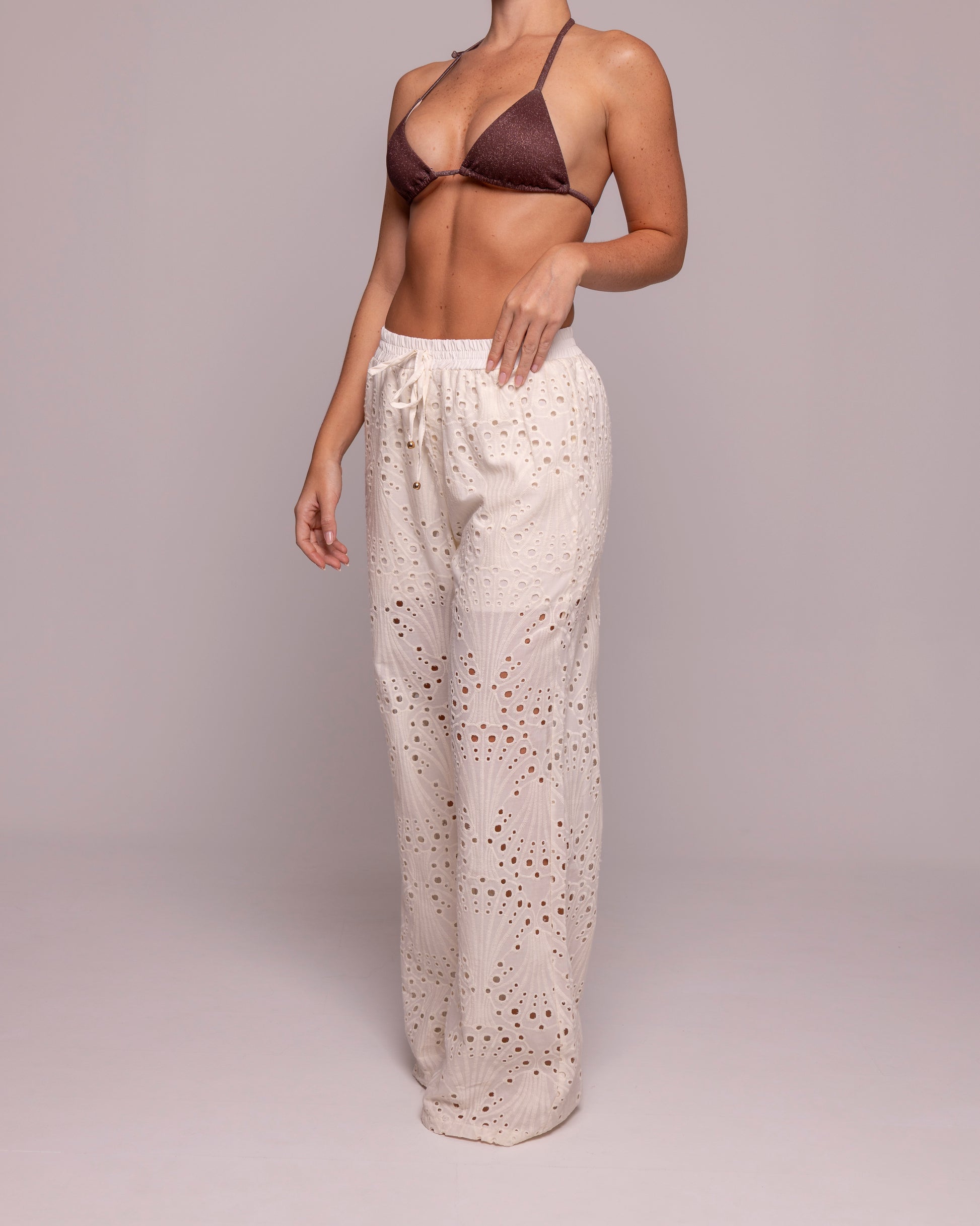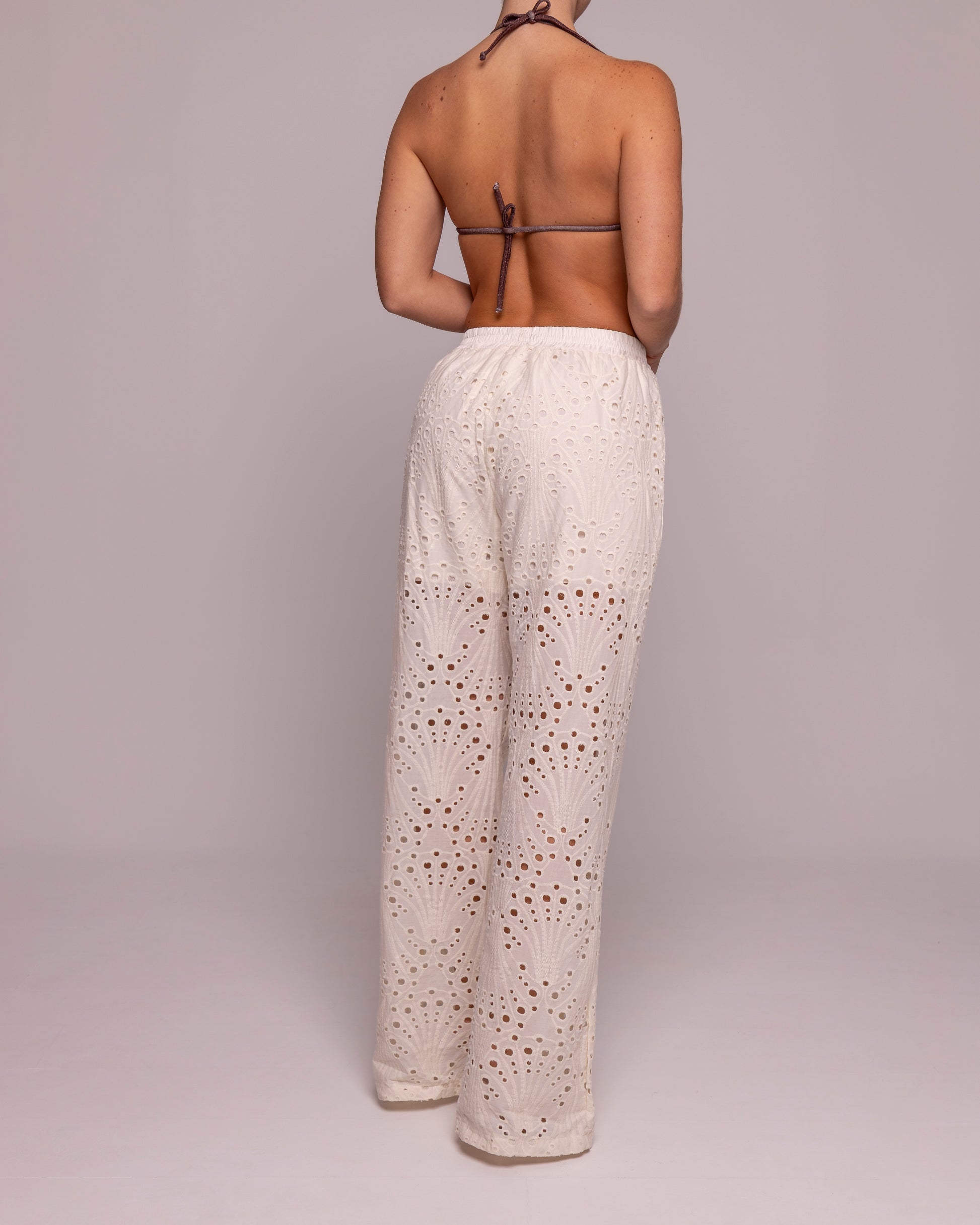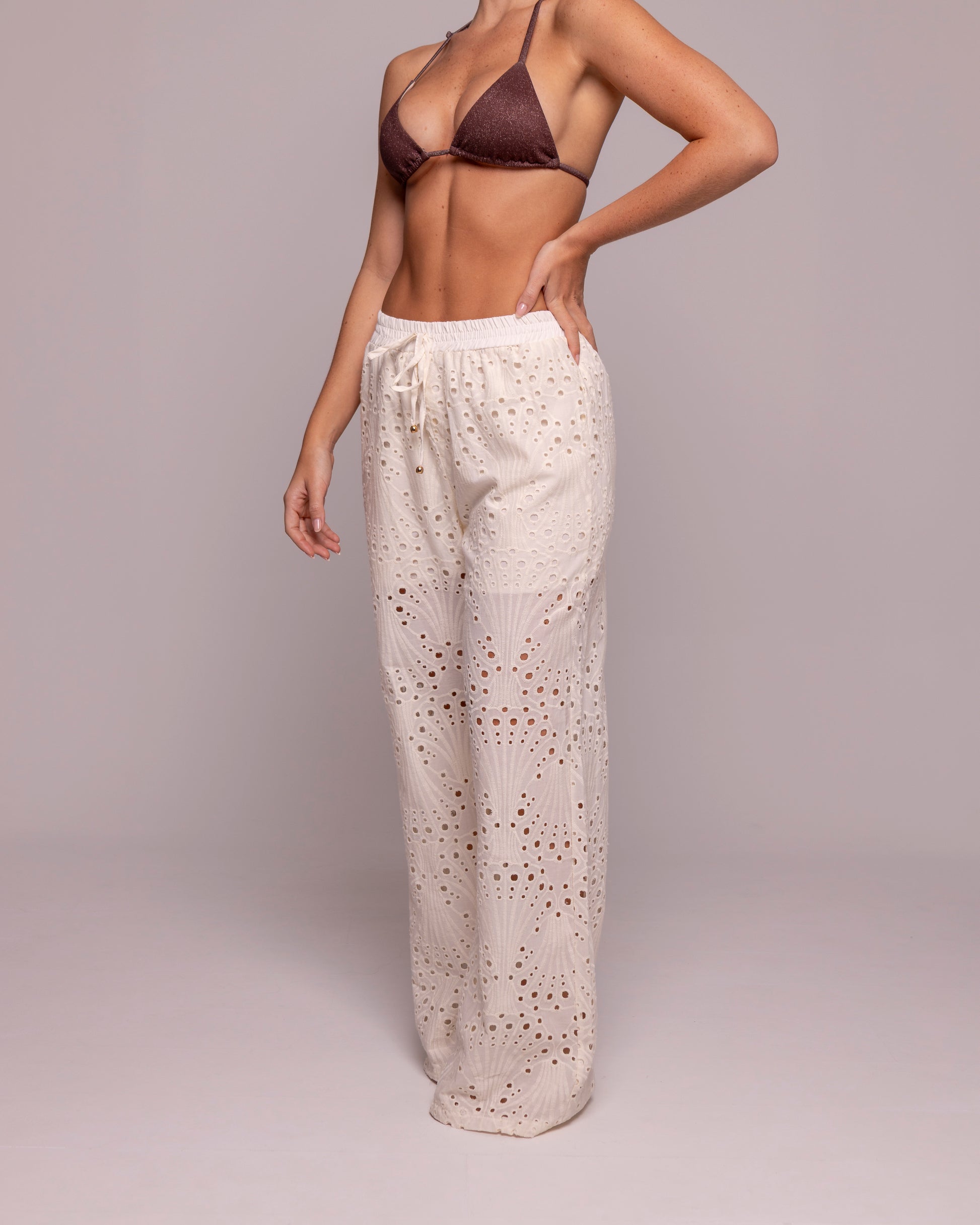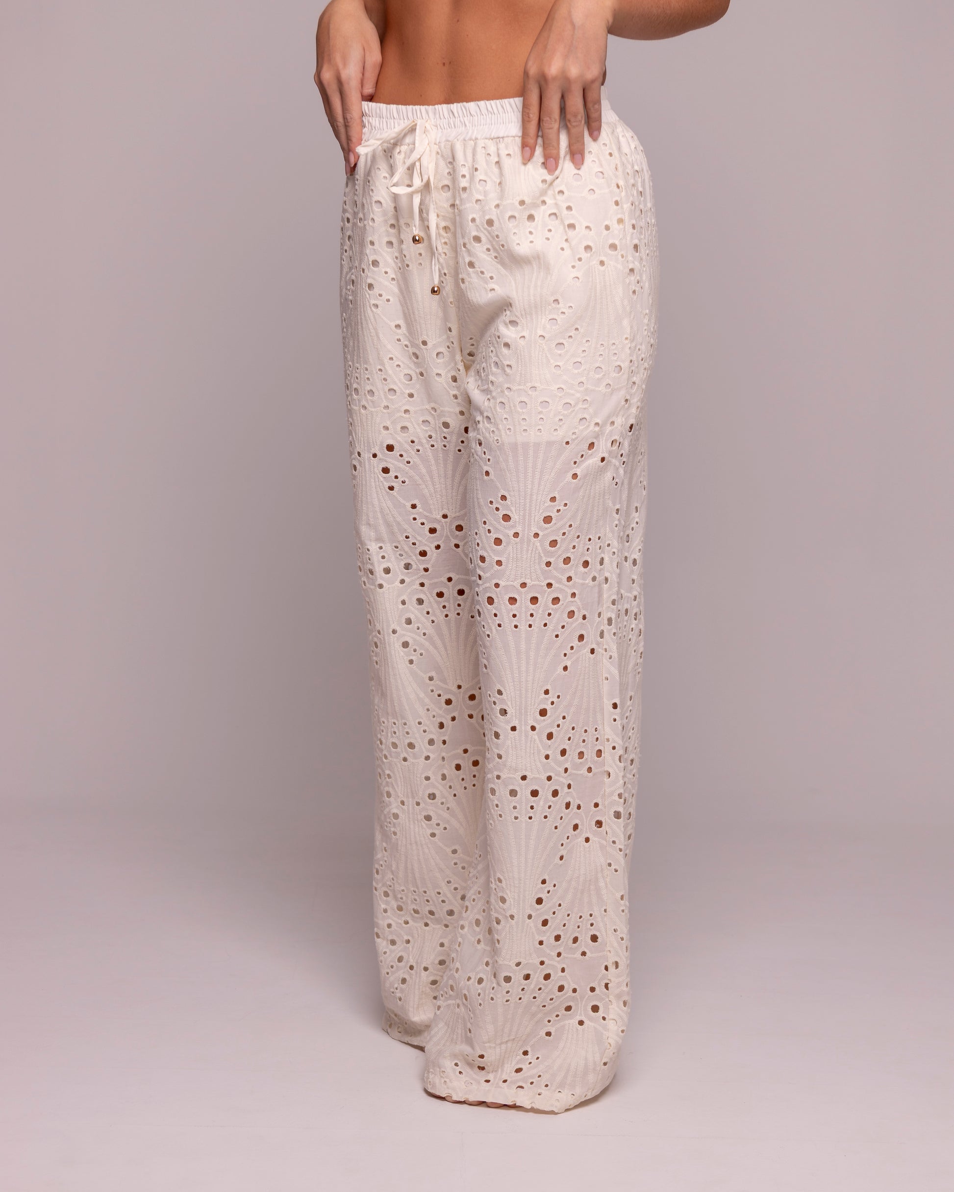 Pantalón en ojalillo beige, de silueta amplia. Perfectos para complementar cualquier outfit.