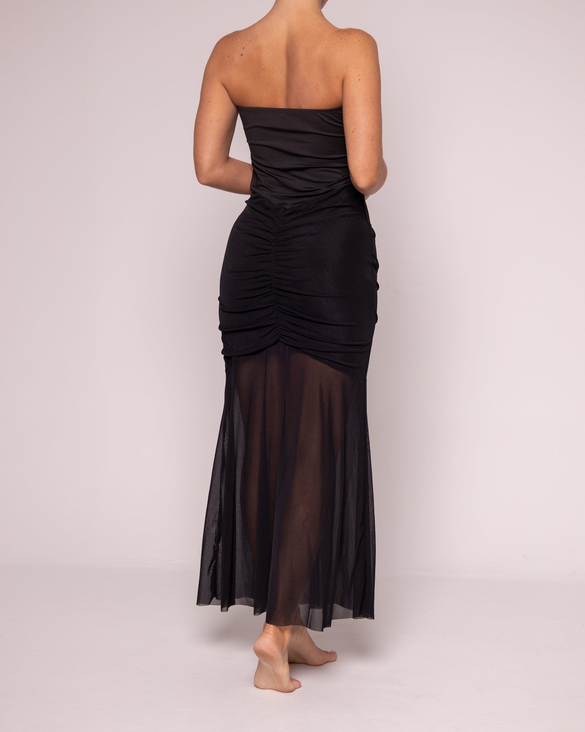 Vestido strapless en el cual se fusionan tres tipos de telas diferentes para crear dimensiones visuales. Sexy y fresco. Cuenta con recogidos en la parte de la falda para estilizar la figura.