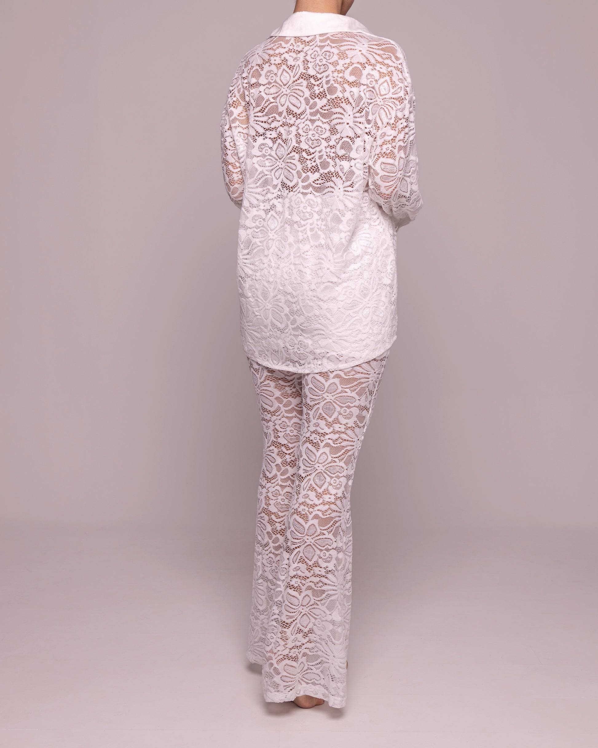 Set de dos piezas (pantalón y camisa) en encaje color blanco. El pantalón tiene un forro tipo “short” para que puedas usar perfectamente este set como salida de baño o darle un giro 360 y usarlo para la noche.
